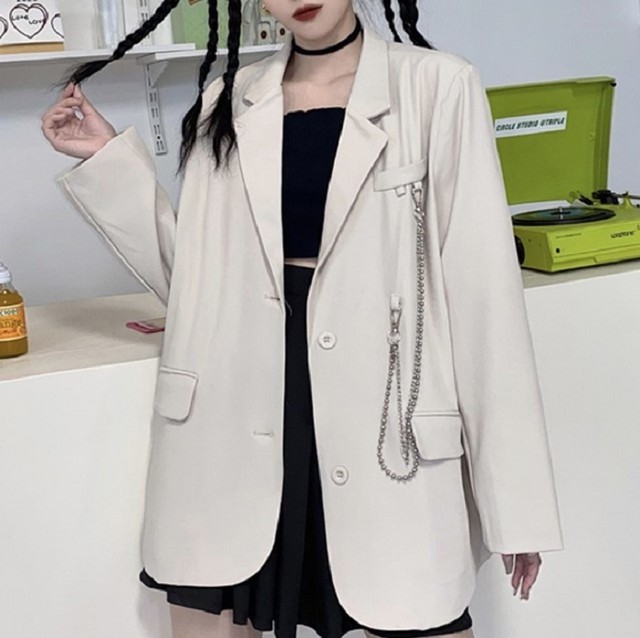 レディース アウター 春秋 アウター レディース スーツ ジャケット ビッグシルエット オーバーサイズ チェーン付き シンプル カジュアル おしゃれ メンズライク お出かけ デート 通勤 通学 キャンパス 旅行 普段着 ブラック アプリコット Hf Haru Meets Foo
